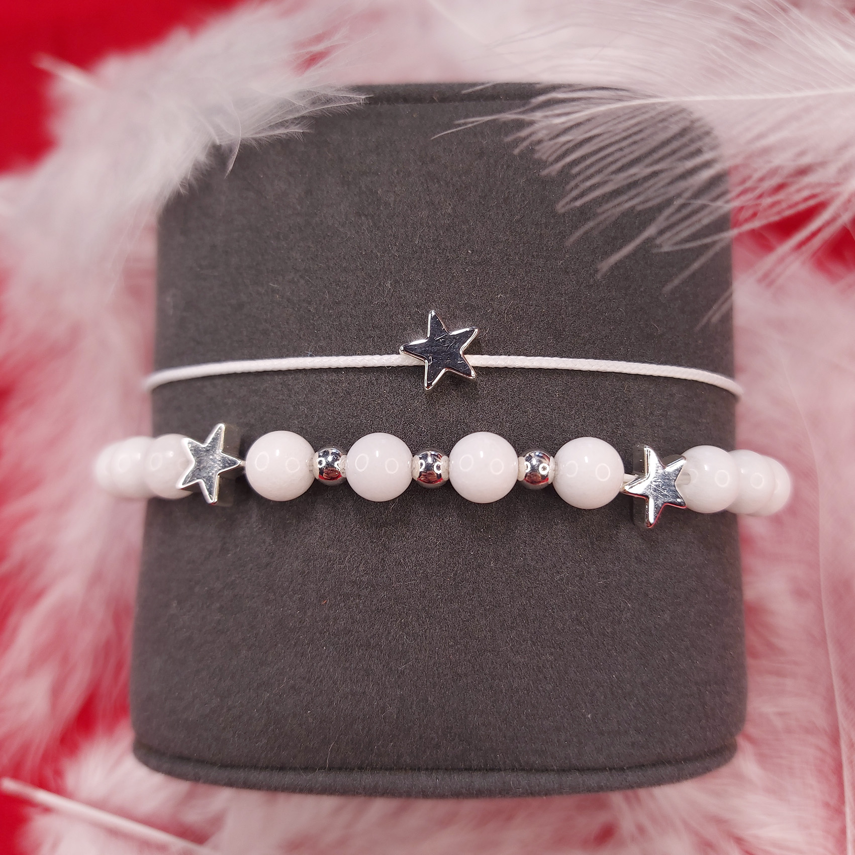 Set dvou náramků, jeden je z bílého jadeitu a korálků z chirurgické oceli, druhý ze šňůrky s hvězdičkou z hematitu. Velikost minerálů je 6 mm, hodí se tak i na dětskou ručku. Jadeit nám dodá pozitivní energii, vitalitu a moudrost. Hematit je kámen ochrany, klidu, míru a harmonie.