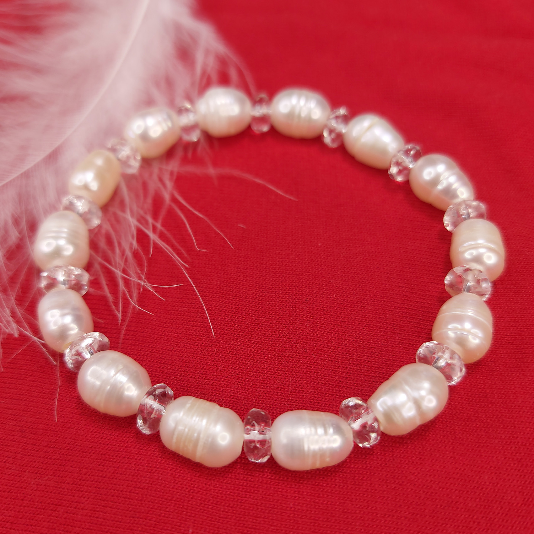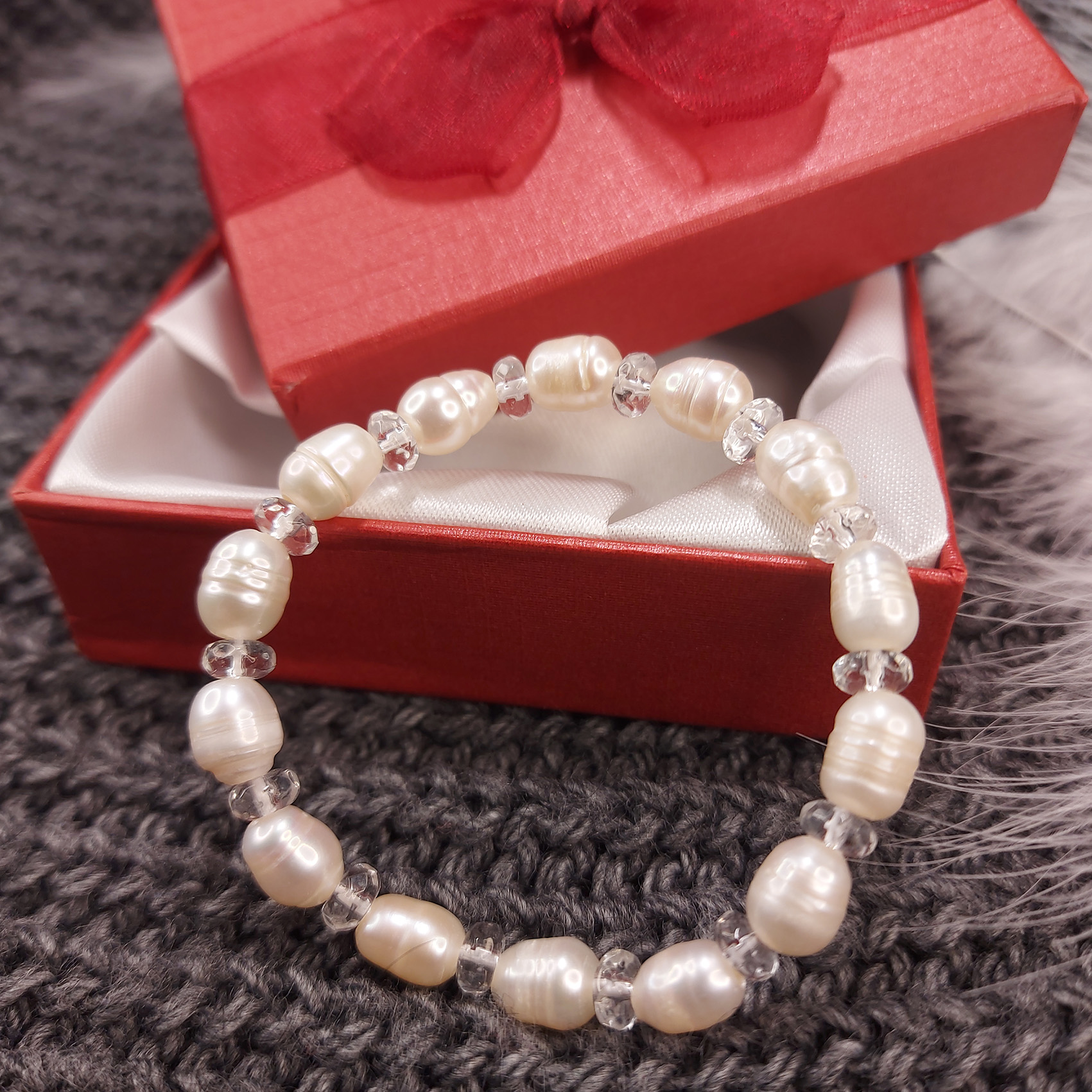Říční perly a křišťálové rondelky. Tyto sladkovodní mají nepravidelný tvar, který je pro ně charakteristický. Perly jsou nádherné, magické a opředené mnoha legendami. Ta nejvíce známá je o tom, že když jsou darovány, tak přinášejí štěstí! A křišťál vám dodá harmonii a čistotu. Tak neváhejte a darujte vánoční štěstí. Dodáváme dárkově zabalené v krásné krabičce. Velikost perel je cca 7 mm.